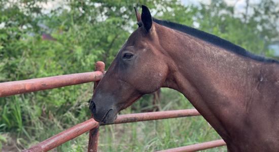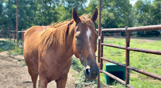 Murphy is a handsome 16-year-old gelding with a striking sorrel coat, a cross between a Thoroughbred and a Quarter Horse. This retired barrel horse has a personality as big as his heart. While he may not be motivated by carrots or watermelon, he has a sophisticated palate and only accepts real horse treats. Murphy loves nothing more than a good groom, a leisurely trail ride with his favorite people, and spending his days grazing peacefully in the pasture. He is a gentle soul who is ready to form a strong bond with anyone he meets.
